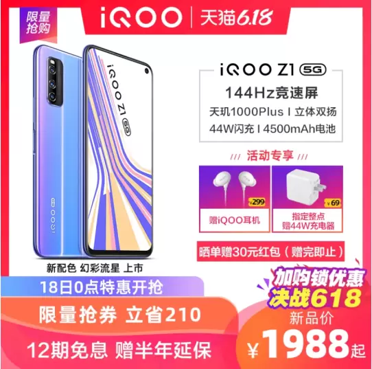 燃爆618!iQOO Z1幻彩流星新配色开售,1988入手5G性能强机