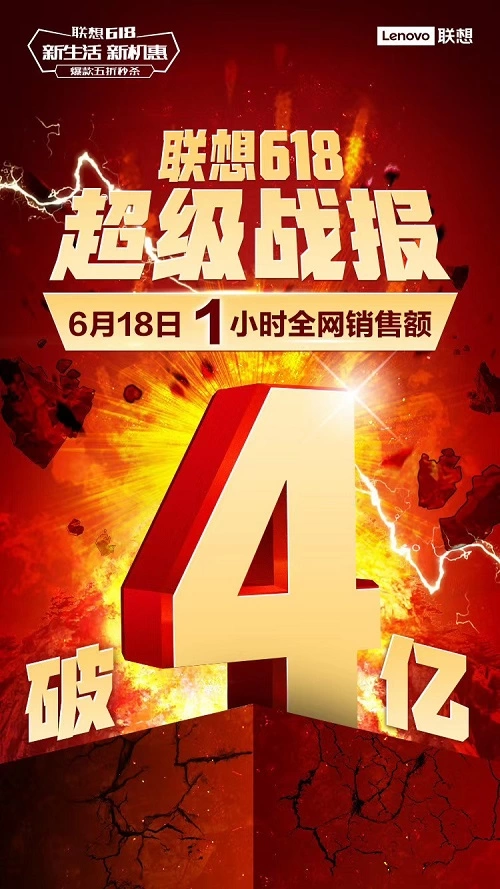 联想618一小时全网销售额破4亿,夺京东电脑数码竞速榜九冠王
