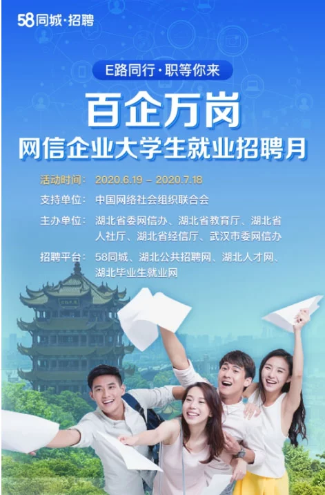 为了落实“六稳”、“六保”工作要求,进一步做好大学生就业促进工作,6月19日-7月18日,58同城携手湖北省委网信办、省教育厅、省人社厅、省经信厅、武汉市委网信办等部门,举办“百企万岗”网信企业大学生就业招聘月活动。此次活动以“E路同行·职等你来”为主题,通过开展线上网络双选会,精准对接企业平台和湖北高校应届毕业生,以优质高效的就业服务为毕业生充分就业保驾护航。