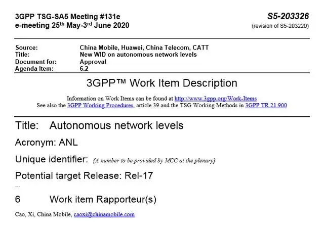 在近日召开的3GPP SA WG5第131e次会议上,中国移动作为独立报告人牵头的自治网络分级标准项目获准立项,该项目得到了中国电信、中国联通、Orange、华为、大唐、中兴、英特尔等10家主流运营商、设备商和芯片制造商的支持。