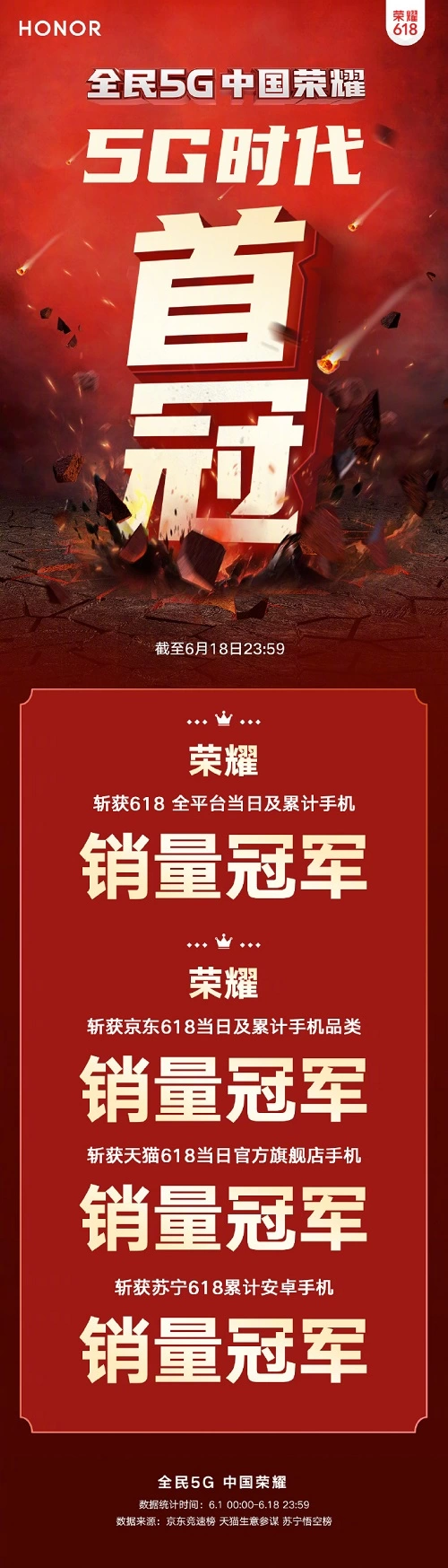 5G时代首冠诞生,荣耀618摘得全平台销量冠军