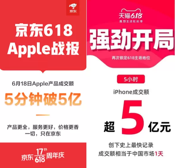 天猫第一时间响应苹果公司,表示将配合Apple产品推出优惠折扣等活动。而Apple入驻多年的京东平台对此并未有过多表示,而是一如往常的为用户提供购机优惠等活动。然而618当天,Apple在两大平台的销量却出现天壤之别:京东Apple产品开局5分钟成交额破5亿,天猫开场5小时iPhone累计成交额5亿。
