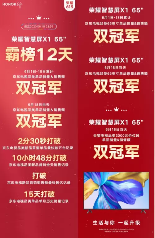 荣耀智慧屏X1系列65英寸在6月18日当天拿下京东电视品类65英寸单品销量&销售额双冠军,6月1日~18日累计京东电视品类65英寸单品销量&销售额双冠军,6月18日当天天猫电视品类3000元价位段单品销量&销售额双冠军。