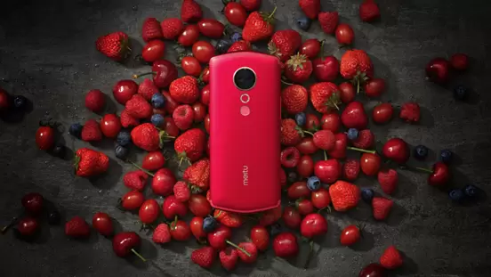 在外观方面,美图T9延续了以往的设计风格,采用了菱形结构的机身设计。在配色方面,美图T9拥有浆果红、星云粉、仙踪绿和湖光蓝四款颜色可选。机身正面采用了一块分辨率为2160×1080的6.01英寸OLED屏幕,前置为双摄设计。机身背面从上到下为横置的双摄,环形闪光灯与指纹解锁,美图的金色Logo位于机身背面底部,也使得手机整体的质感提升不少。
