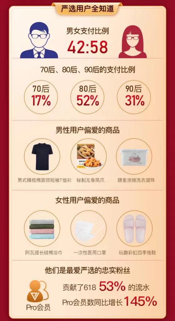6月1日是严选“618”大促的开门红首日,当日Pro会员提前享用75折券,用户可享受专属特价,当日流水占比达历史高峰;Pro会员与云音乐黑胶VIP联合会员打造、丁磊直播间实体卡售卖等方式,让严选618大促期间Pro会员数规模同比增长145%,Pro会员贡献流水占整个618的53%。
