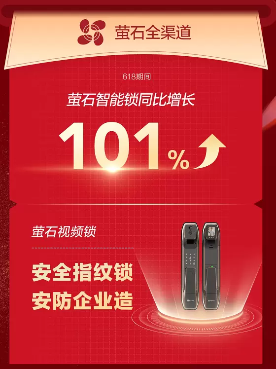 萤石智能锁同样爆发出了“洪荒之力”,在多平台发布的智能家居领域销量榜单上都名列前茅,展示出“可怕”的市场战斗力,618期间,萤石品牌智能锁全渠道销售额同比增长101%,成为用户优先选择的热门品牌之一。