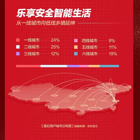 另外,《2020中国智能家居生态发展白皮书》中指出,25-35岁范围内的智能家居用户数最多,80后、90后成绝对用户群主力,多为后装改善性的单点需求。从增长趋势来看,互联网原住民的00后、95后,终端接受度持续攀升,年轻人更重视单点功能与联动场景需求,设计颜值,也更入95、00后“赏心悦目”的法眼。智能家居开始向更广大的三四线城市的年轻用户下沉,京东官方数据显示,萤石在三至六线城市的消费者占比达高达51%。