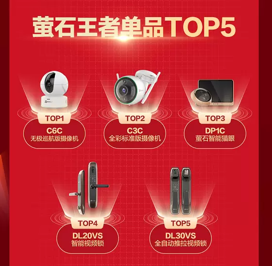 自2017年起,萤石智能家居摄像机连续多年稳坐天猫平台网络摄像机类目单品、单店及品牌榜第一的宝座,萤石正成为家庭安防的第一梯队领头羊,家庭智能摄像机品类已经演化出寡头。