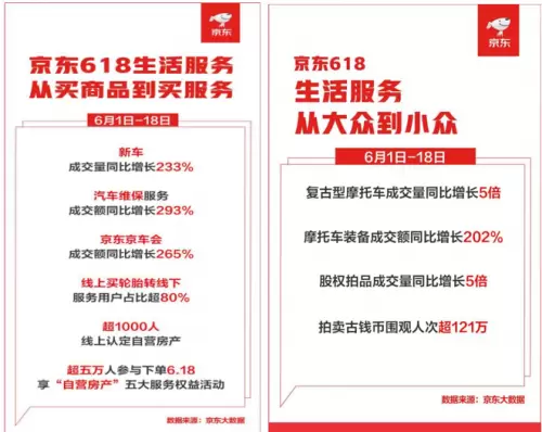 6月1日-6月18日,京东新车成交量同比增长233%,汽车维保服务同比增长293%。线上房产服务咨询量增长6倍,线上订单量增长4倍。高速增长的背后,彰显京东生活服务事业群打通线上线下,以服务型消费带动零售增长的决心。
