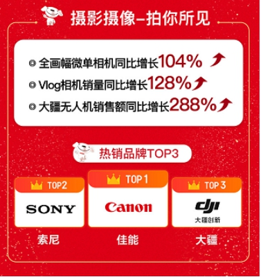 一段时间以来,很多人体验闷在家中几个月后,越来越多人发现解决家庭娱乐问题的重要性。于是游戏主机、高清投影仪以及记录生活的Vlog相机等影像数码产品纷纷迎来了热销潮流,且逐渐成为了人们的新宠。从京东影像618巅峰24小时的战报中可以看到,索尼、佳能、大疆位于摄影摄像的排名前三甲。其中,全画幅微单相机同比增长104%,Vlog相机销量实现128%的同比增长,而大疆无人机销售额则同比增长288%,涨势喜人。