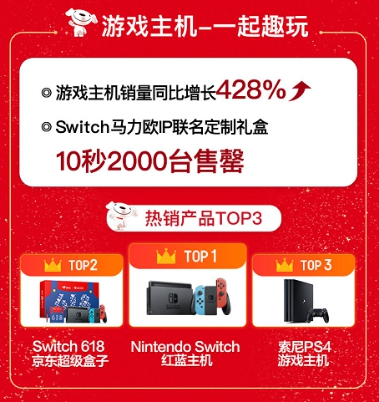 而在宅家人群热衷的游戏神器方面,Switch 618京东超级盒子、Nintendo Switch红蓝主机、索尼PS4游戏主机在热销榜单上排名前三,其中,游戏主机销量同比增长达428%,Switch马力欧IP联名定制礼盒2000台便在10秒内迅速售罄,一展惊人实力。