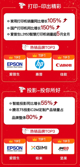 在家用打印机方面,爱普生、惠普、佳能三大品牌位于热销的TOP3。其中,家用打印机销量同比增长105%,国产打印机也实现了150%的增长,尤其值得一提的是,爱普生L3153智慧打印机销量便轻松超5月全月,涨势惊人。在投影方面,智能投影同比增长55%。而随着用户消费习惯越来越个性化,腾讯T5投影C2M定制产品销量更是占品牌整体的80%,爱普生、极米、坚果更是位于热销品牌的前三甲。