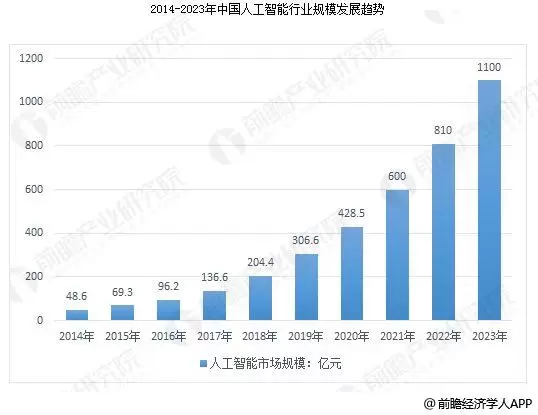 据前瞻产业研究院《2018-2023年中国人工智能行业市场前瞻与投资战略规划分析报告》数据显示,2015年中国人工智能市场规模69亿元,同比增长40%,2016年达到96亿元,此后在技术和应用的驱动下,继续快速发展,同比增速超过40%,到2023年市场规模达到1100亿元,并带动相关产业规模增长超过1000亿元。