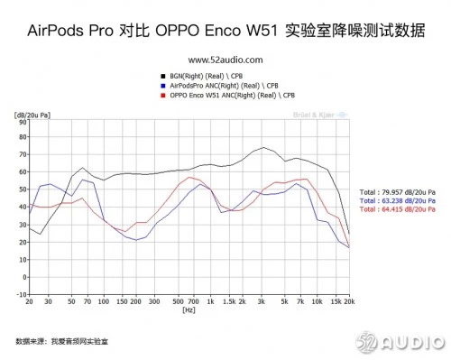 我爱音频网还将OPPO Enco W51与AirPods Pro的降噪数据进行了对比。如图所示,可以非常直观地看到,在主动降噪表现上与AirPods Pro实力相当。而OPPO Enco W51仅售499元,比起动辄千元的降噪耳机确实超值。