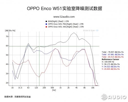 OPPO Enco W51在耳机设计上采用了入耳式的结构,同时耳机与耳朵接触的部分设计巧妙,耳塞材质细腻能够与耳朵很好的贴合,因此在耳机结构上就能够带来有效的物理降噪效果,从上图的PNC蓝线也能够清晰的看出。