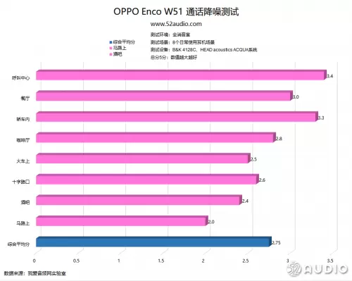 从报告中可以直观地看出,OPPO Enco W51在8个噪声测试场景下的噪声抑制和人声还原表现良好,综合评分2.75已经达到了中上的水平,能够满足使用者在日常生活中众多场景的通话要求,在大部分场景都能够带来良好的降低噪声的体验。