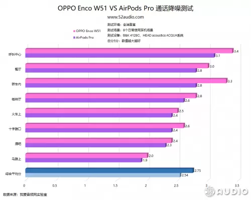 除此以外,我爱音频网又一次将OPPO Enco W51和AirPods Pro的数据进行了对比。这两款耳机的通话降噪效果综合评分显示,AirPods Pro为2.54分,OPPO Enco W51为2.75分,在真无线降噪耳机产品上OPPO再次比行业老大哥Apple小胜一筹。
