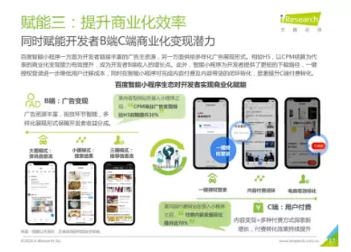 降低成本的同时,小程序还可以帮助开发者提升商业化效率。艾瑞仍以百度智能小程序为例,某内容型网站在接入百度智能小程序之后,CPM商业广告变现相比H5时期提升了30%以上。此外,百度智能小程序还通过一键授权登录降低用户迁移成本,并打造内容付费及内容带货的转化闭环,这也显著提升了C端付费转化。某内容付费网站在接入百度智能小程序之后,付费内容变现转化提升了近70%。
