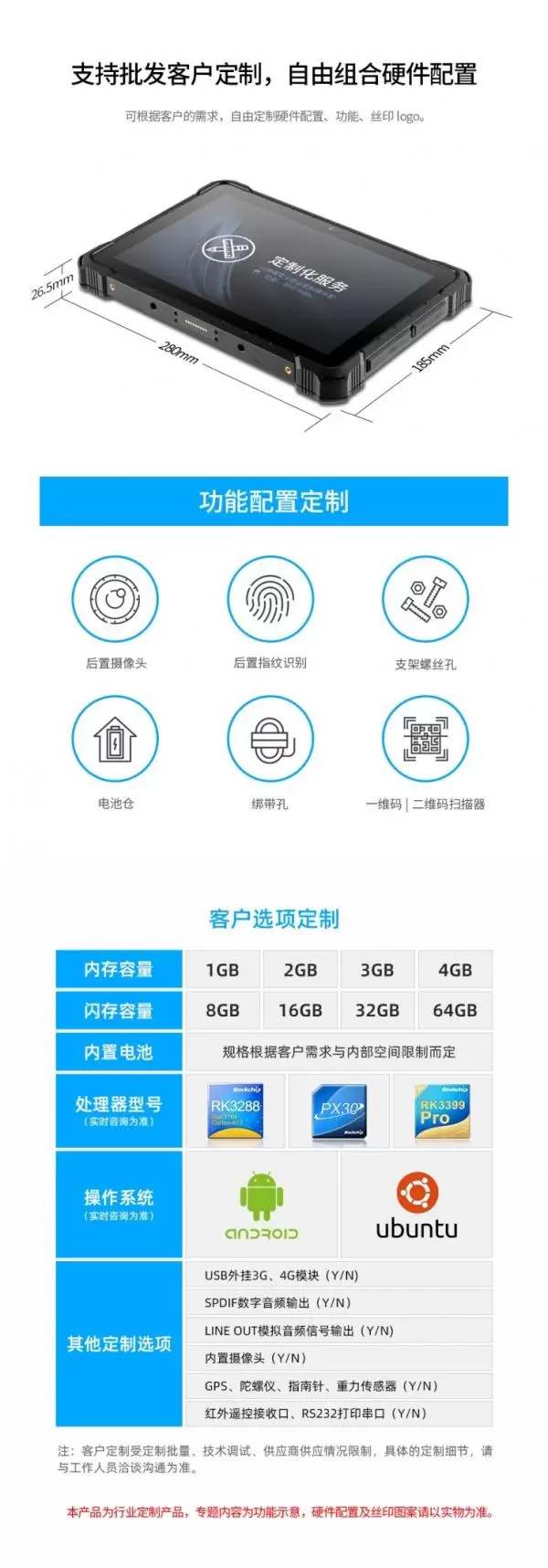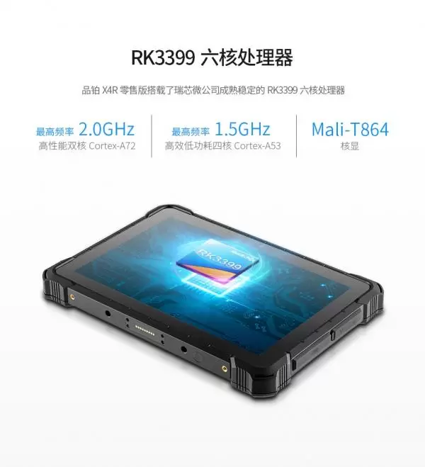 这款机器采用了RockChipRK3399处理器,并搭载4GB内存及64GB的EMMC固态硬盘。虽然硬件性能方面,X4R平板电脑显得并不强悍,但这款三防平板电脑是针对恶劣环境及高强度工业应用而开发的产品,所以纸面参数并不能体现它的强大之处。它相比普通的平板电脑,具有出色的抗摔、防水、防尘性能,而且安全性及散热设计也比普通的平板电脑要好很多,足以胜任连续的工作。