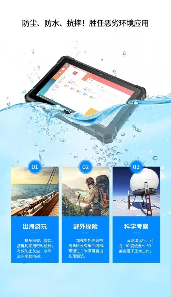 品铂X4R三防平板电脑具有IP67级三防性能(具有6级防尘、7级防水的性能),并在机器的边框设计有防摔缓冲结构,可以通过1米自由跌落测试,是一款可以在恶劣环境下工作的三防电脑。