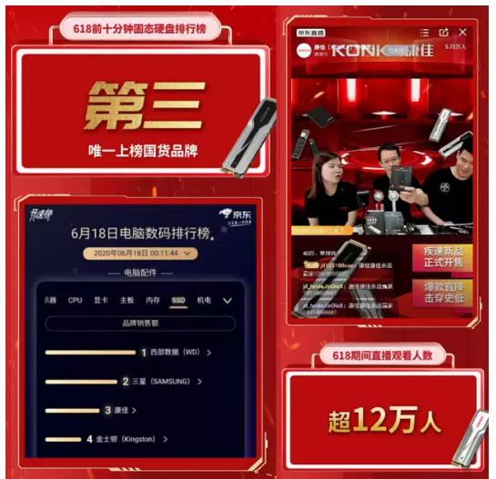 当晚零点过后,在京东电脑数码销量排行榜中SSD这一板块,康佳存储成为唯一上榜的国货品牌,位居西部数据、三星之后,以不小的数据差和后面的金士顿拉开,在各大巨头中脱颖而出,足以可见康佳的实力与玩家用户对它的认可。其中康佳最受欢迎的产品是旗下的K520 2.5英寸 500GB SSD,SATA果然还是目前市场上的当道。当晚康佳同时进行了直播活动,带来超实惠的价格,吸引众多观众前来关注,直播间观看人数达到12万人以上