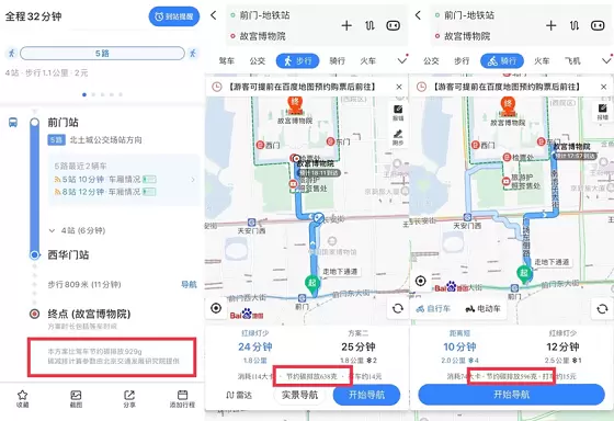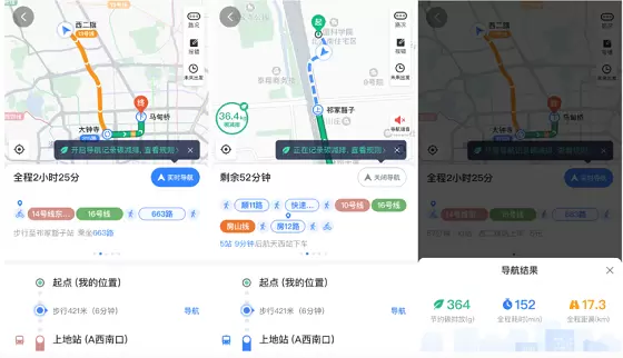 在行进过程当中,百度地图也能做到实时记录。用户在乘坐公交地铁时开启到站提醒或导航功能,或是在步行和骑行时使用导航,便可将步数或里程转换为对应的碳减排量,让走过的每一步路都“算数”,更直观的感受绿色出行的力量。