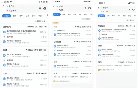 除了常见的市内出行,针对异地出差、旅游的用户,百度地图也能提供具有高性价比的公共交通出行方案。以往人们前往其他省份或城市时,总要花费很多力气做好每一步的行程安排,精心计算换乘时间和价格,只为选择一条既快速又高性价比的出行线路。而百度地图独家推出的“跨城空铁组合方案”,让用户只需要输入出发和到达城市,便可看到飞机、高铁、火车的组合出行方案,且耗时、所需价格、航班、列车班次也一一展示出来。“跨城空铁组合方案”在对比以往的异地出行方式上,最大的特点在于:比飞机出行更便宜、比火车/高铁出行更快,为跨城出行用户提供了更丰富、性价比更高的参考方案,提升出行的便捷性。