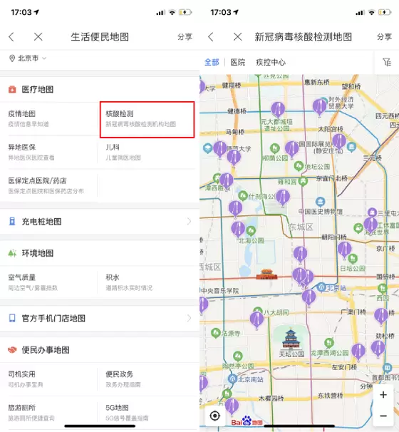 (百度地图“核酸检测专题地图”与“疫情小区地图”)