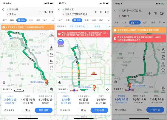 作为国民出行APP,百度地图时刻紧跟疫情发展态势,不断跟进功能服务满足用户出行需求。此前,百度地图依据北京市卫健委官方公布信息,推出核酸检测专题地图,详细整合北京市128家具备核酸检测能力的机构信息,方便有需要的市民快速查询并就近前往。同时,百度地图北京市疫情小区地图紧急上线,用户可实时获悉周边疫情场所个数、最近的疫情点以及该场所周边人流聚集地。值得一提的是,百度地图还充分运用导航语音提示,在用户将导航目的地设置为北京以外城市或疫情中高风险区域及街道时,将依据各地卫健委及国务院客户端公示的官方信息,及时给予出京政策、中高风险等级区域及街道需加强自身防护等温馨语音提醒,加之醒目的文字提示条,有效强化用户安全出行意识。