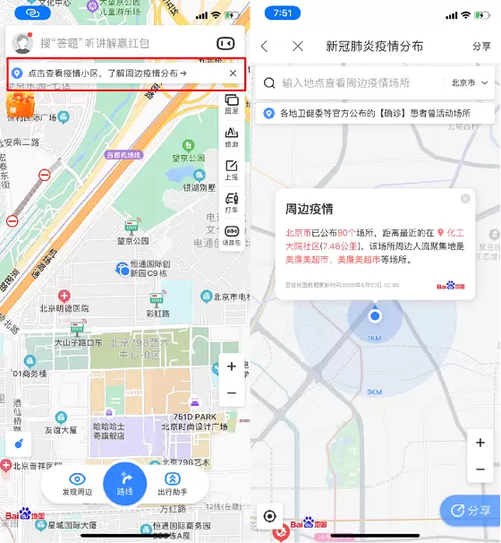 (百度地图“出京提醒”及“终点为疫情地点提醒”)