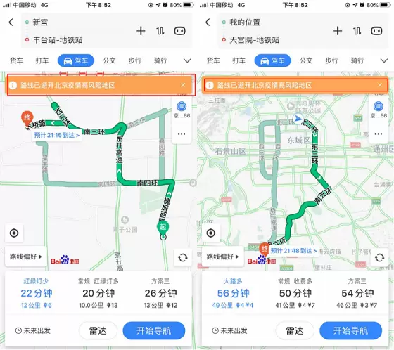 除此之外,针对疫情风险区部分道路实施管控及出行安全系数低的问题,百度地图还推出导航避让疫情区域功能,优化导航线路、提供绕行方案。用户在驾车途经疫情高风险区域时,百度地图将会优先推荐绕行路线,并给予“路线已避开北京疫情高风险地区”的文字提醒,引导公众避开疫情高风险区,减少感染风险,在保障用户安全出行的同时提高出行效率。