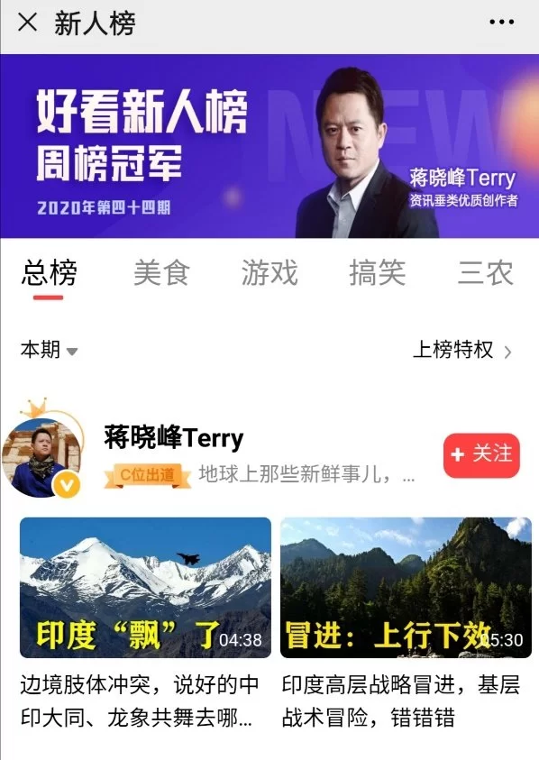 6月23日,好看视频公布2020年第44期新人榜周榜单,军事垂类优质创作者蒋晓峰登上榜首。据悉,好看视频新人榜是好看视频最具潜力的优质原创作者榜单,结合周新增粉丝数、周发布视频量及作品播放量、转评赞数量等维度综合评定。数据显示,近一周时间蒋晓峰紧跟国际时政热点,创作出多支爆款视频,总播放量接近850万、转评赞超过8.5万。