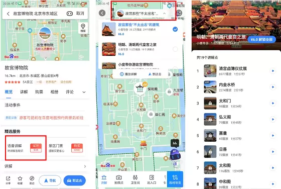 真人语音讲解功能的操作也十分简单。以故宫为例,用户在百度地图搜索“故宫”后,可在地点详情页中点击“语音讲解”进入AI导游。点击AI导游页面上方的标题栏,在弹出的列表中选择其中任一专辑播放即可。例如选择专辑“明朝、清朝两代皇宫之旅”,点开就可进入收听包含“清宫卤簿仪仗展”、“内金水桥”等在内的19个子景点的讲解内容,生动回溯历史。不仅能帮用户把景区了解得透透彻彻,还可以避免因“蹭导游”而导致人群聚集,在安全游玩中升级旅游体验。
