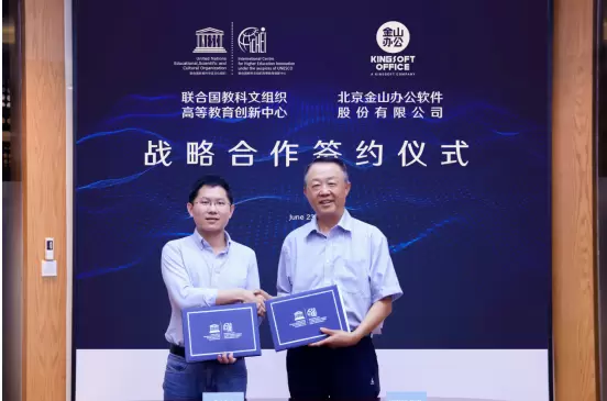 当天下午4点,金山办公与联合国教科文组织高等教育创新中心在深圳举行签约仪式,双方正式签署了《关于国际网络教育学院的合作框架协议》。根据双方合作协议,金山办公正式入驻联合国教科文组织高等教育创新中心下属国际网络教育学院,将WPS OFFICE相关在线课程接入这一全球教育资源平台,为亚太和非洲地区发展中国家的高等教育发展提供帮助。