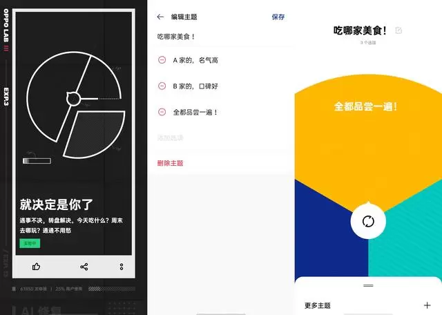 碰到周边美食太多,犹豫不知道吃哪家也不用慌,不妨打开 OPPO LAB,让「就决定是你了」来结束纠结。当然,喜欢美食的我们可以一家家吃过去,这样就不用纠结了。