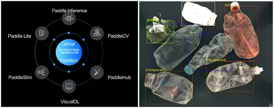 决心干好中国垃圾清道夫活计的金漉科技,选择了在AI领域浸淫最深的百度。运用飞桨PaddleX全流程开发工具,他们很快推出了一套高性能方案:先用检测判别垃圾种类、再借助分割模型找到垃圾边缘确定中点位置,然后将结果传递给机械臂,分拣!搞定!识别时间在500毫秒以内,效率飞快。