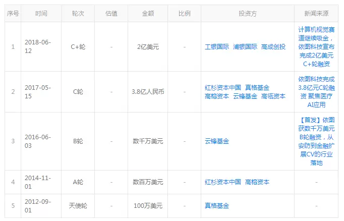 此前,依图科技还于2016年6月获得了云锋基金领投的B轮数千万美元投资,2014年获得高榕资本A轮数百万美元投资,更早之前则获得真格基金天使轮投资。
