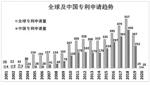 笔者使用Incopat检索平台对投影光源技术进行了专利检索。截至2020年6月3日,全球范围内投影光源技术相关专利共4707件(合并简单同族后)。从申请量增长趋势上来看,自2001年以来,全球专利申请量在2005年至2009年、2010年至2014年、2015年至今经历了三次增长,而中国专利申请在2010年之前占比较低,自2010年起中国专利年申请量超过100件,申请量的增长得益于LED光源技术的发展,2015年以来年申请量均超过200件,投影光源技术发展迅速,智能投影市场十分活跃(图1)。