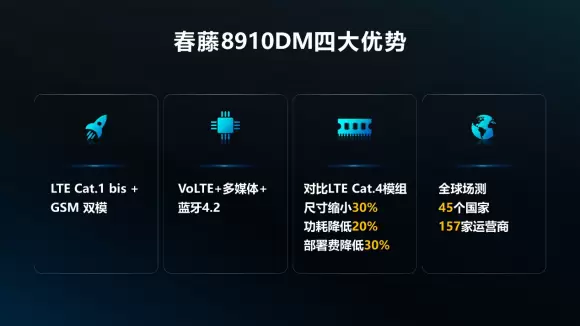 春藤8910DM以更广的覆盖、更快的速度、更低的延时,帮助客户实现更多产品特性,是兼顾制式、性能、功耗、成本的优选物联网解决方案。春藤8910DM已在全球45个国家、157家运营商网络下完成了规模场测。