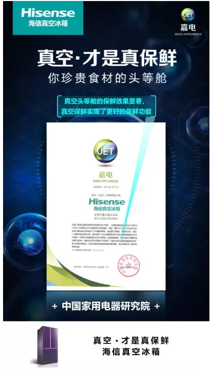 近日,中国家用电器研究院设计研究与评测中心对海信真空冰箱进行了评测,测评结果显示“真空头等舱的保鲜效果显著,真空保鲜实现了更好的保鲜功能。”