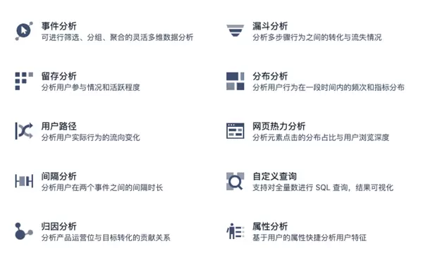 比如,通过人均session深度分析发现用户在滞后环节的流失率远大于常规的流失率,并且大多数用户的卡点一致,则可以结合多分析模型进行卡点的诊断或支付流程的简化等(如下图,为神策数据提供的部分热门分析模型)。