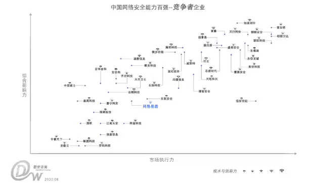据悉,数世咨询是在中国网络空间安全协会的指导和支持下,历经四个多月的时间,通过深入分析与统计计算,从而撰写完成了《2020年中国网络安全产业统计报告》。而“中国网络安全能力100强“,则是在《2020年中国网络安全产业统计报告》的基础之上,从500家网络安全企业中选择了100家具备代表性的企业,按照综合影响力、市场执行力、技术与创新力三大维度,以数轴点阵图的形式将100家企业展现出来。