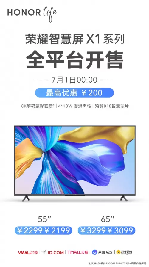 继618大促期间斩获多项冠军后,被誉为“年度真香大屏”的荣耀智慧屏X1系列今日全平台开售,下单最高可享200元优惠。其中荣耀智慧屏X1 55英寸到手为2199元,65英寸3099元,销售平台为华为商城、京东、天猫、荣耀亲选和苏宁易购。