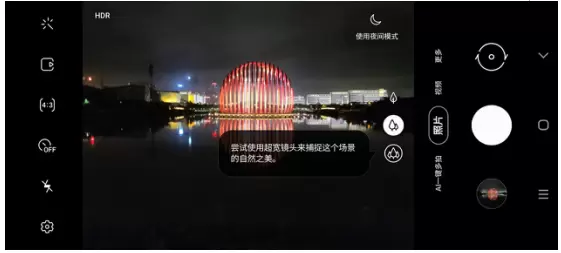 比如,在夜间的大场景风光拍摄时,在相机取景界面,相机APP会提示,建议“使用夜间模式”、“尝试使用超宽镜头来捕捉这个场景的自然之美”,而我们所要做的只是按下快门,即可得到一张出色的夜景样张。