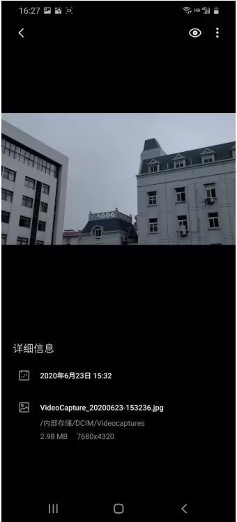 值得一提的是,8K视频快照与我们传统意义上的屏幕截图又有明显不同,屏幕截图一定程度上会降低图片成像质量,但8K视频拍摄可以保持高分辨率,就像实际拍摄的照片一样,通过查看文件信息看到,快照的分辨率高达7680X4320,属于高清范畴,这样的体验也让我们的影像更具可玩性。