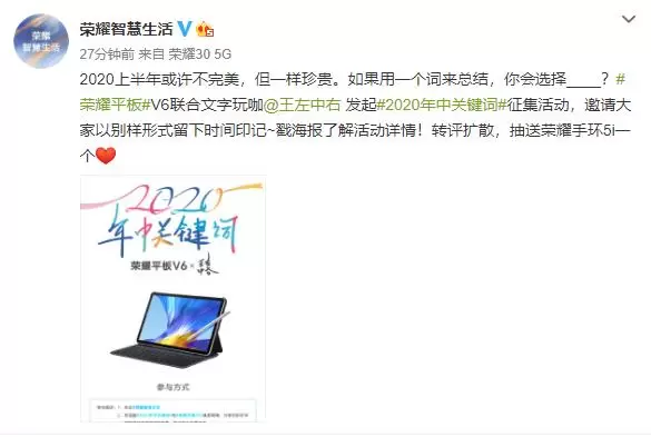 2020上半年最后一天,你会用什么词总结这半年?6月30日,荣耀智慧生活官微发布一张"2020年中关键词"征集海报,宣布荣耀平板V6联合"文字玩咖"王左中右共同发起关键词征集活动,鼓励网友晒出自己心目中的关键词并讲述背后的故事。此外,荣耀智慧生活官微将从创作者中随机抽选一位参与者,送出5G版荣耀平板V6一台。