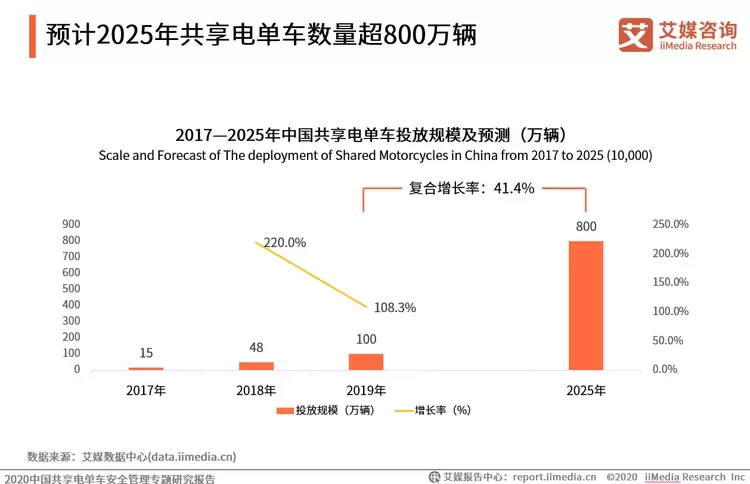 iiMedia Research(艾媒咨询)数据显示,2019年中国共享电单车数量已超过100万辆。未来五年,随着各大平台稳步推进共享电单车投放布局,用户共享电单车需求将进一步得到激发,尤其在三四线城市的渗透率将保持快速增长态势,预计2025年共享电单车投放车辆可达到800万辆,收入规模将达到200亿元。
