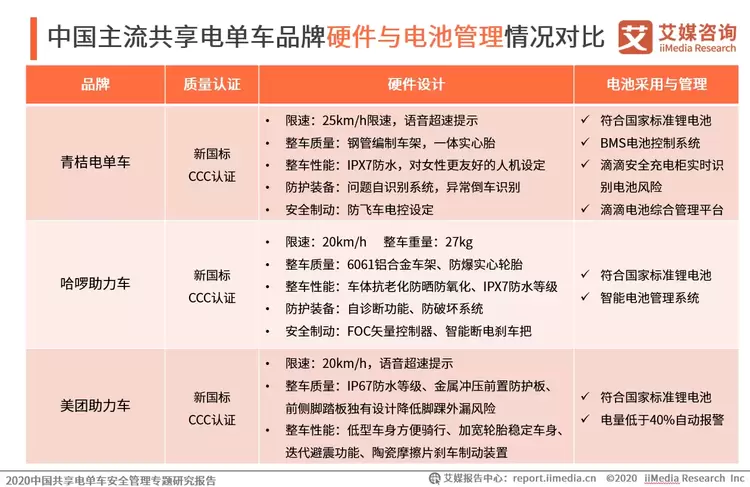 目前,青桔电单车、美团助力车等主流共享电单车平台,其运营车辆普遍获得新国标及3C认证。此外,在新国标要求基础上,主流共享电单车平台还在进一步提升自身产品安全标准,以新技术运用提升车辆安全性。