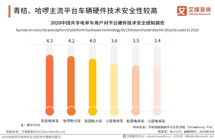 iiMedia Research(艾媒咨询)调研数据显示,在硬件技术安全层面,青桔电单车以4.3的分值占据首位。青桔电单车自主建立APQP分级递进式开发流程把控产品质量,在硬件设计上引入“失效安全概念”,实时识别各功能模块工作缺陷,并依托BMS电池控制系统、滴滴智能安全充电柜以及滴滴电池综合管理平台,多维度管控电池电力安全。