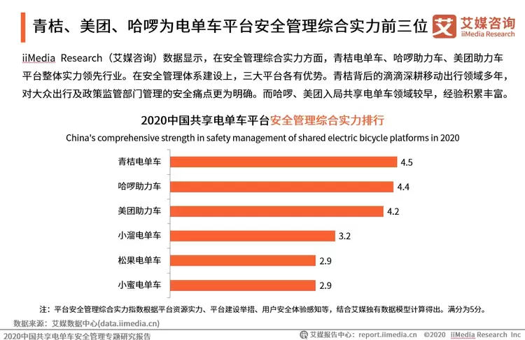 iiMedia Research(艾媒咨询)数据显示,在安全管理综合实力方面,青桔、美团、哈啰为电单车平台管理综合实力前三位,并和后几位的电单品牌得分拉开较大差距。